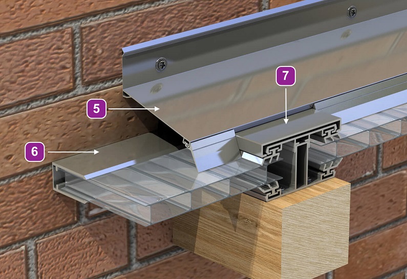 Die Stegplatten werden an den unteren Stirnseiten mit dem Alu-Abschlussprofil verschlossen, um das Verschmutzen der Hohlkammern durch Algen- und Moosbildung zu verhindern. Das Abschlussprofil muss vor der Montage zusätzlich am untersten Punkt mit Ablaufbohrungen ausgerüstet werden, damit Kondensat besser abgeführt werden kann. Nun werden die Alu-Abschlussprofile am unteren Plattenende aufgesetzt.